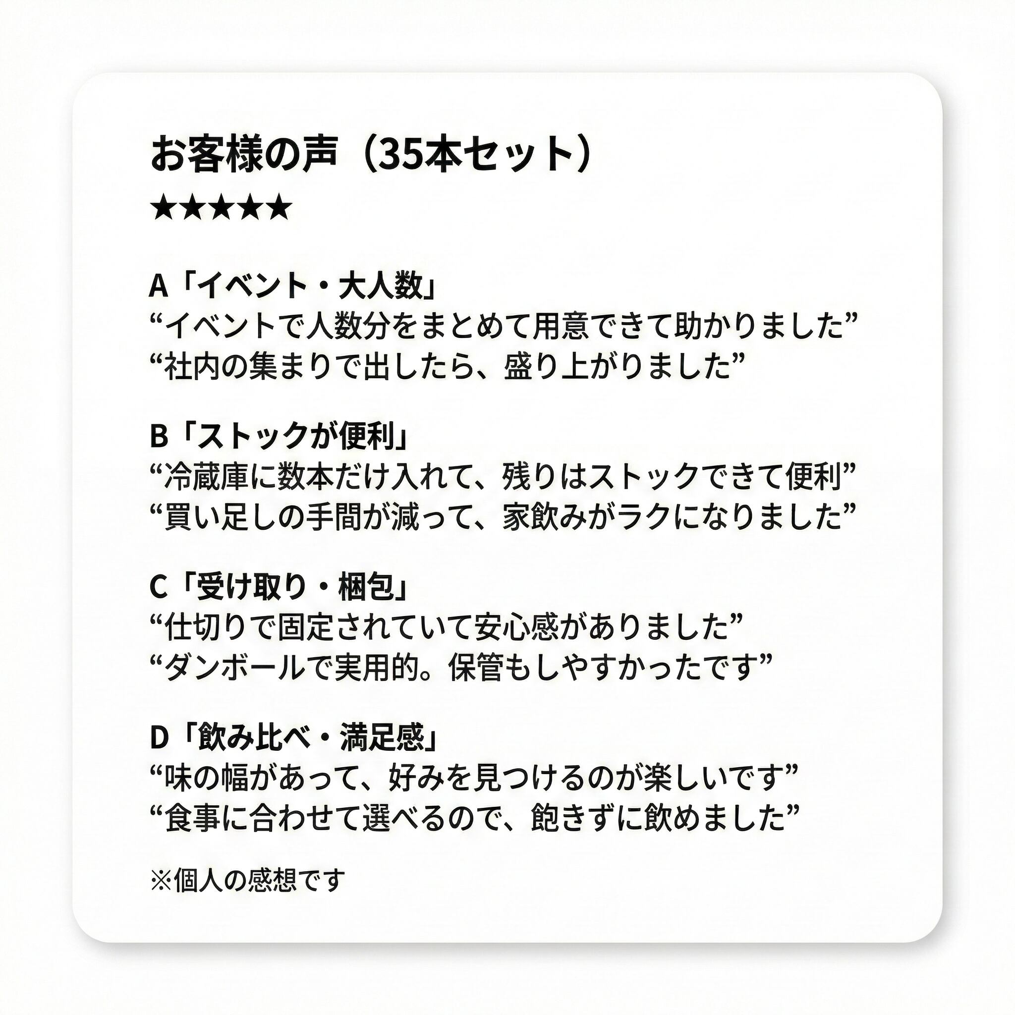 こちらは35本の大容量セットです。冷蔵庫や保管場所にストックしておけば、